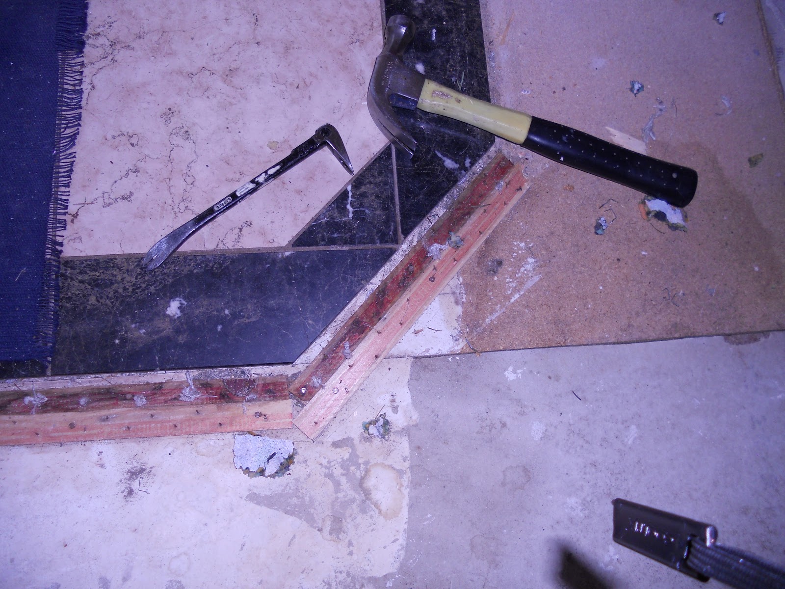 With all that said, we have been putting up with this horrible light blue carpeting for quite awhile now. We've tried cleaning it a few times, but each time spots that had not been there before were there when things dried. That was frustrating to say the least, and just plain NASTY! We have been talking for a couple of years about eventually putting wood laminate flooring throughout the house. We had been thinking that our next project would be replacing the windows since the current ones are not energy efficient at all. That idea went out the window, ha, no pun intended, when we ripped up the carpet in the dining room yesterday and finished pulling up the tack strips today.